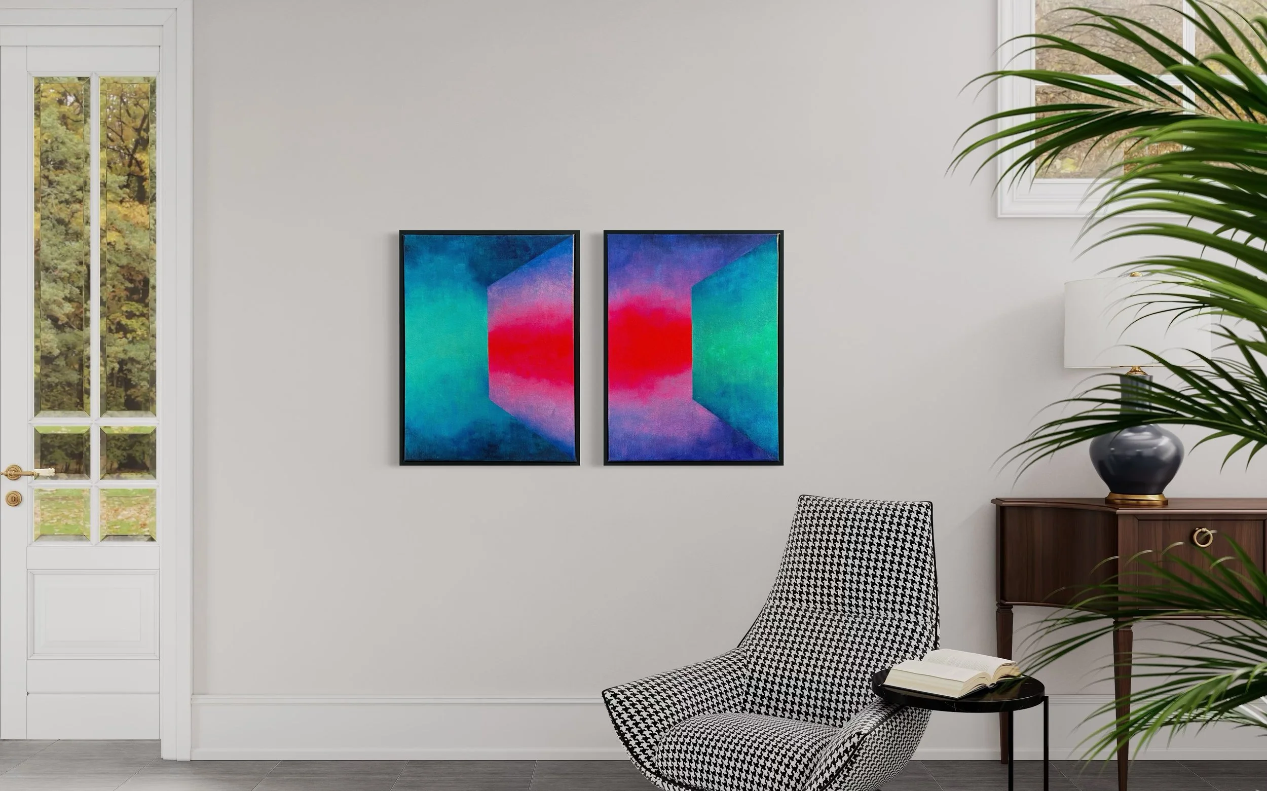 In the final piece, the door opens into a new beginning. Bright, geometric patterns burst forward, symbolizing a release and acceptance of the unknown. Here, transition is complete—a new path forged, with bold lines and vibrant colors suggesting hope, energy, and the excitement of what lies ahead.