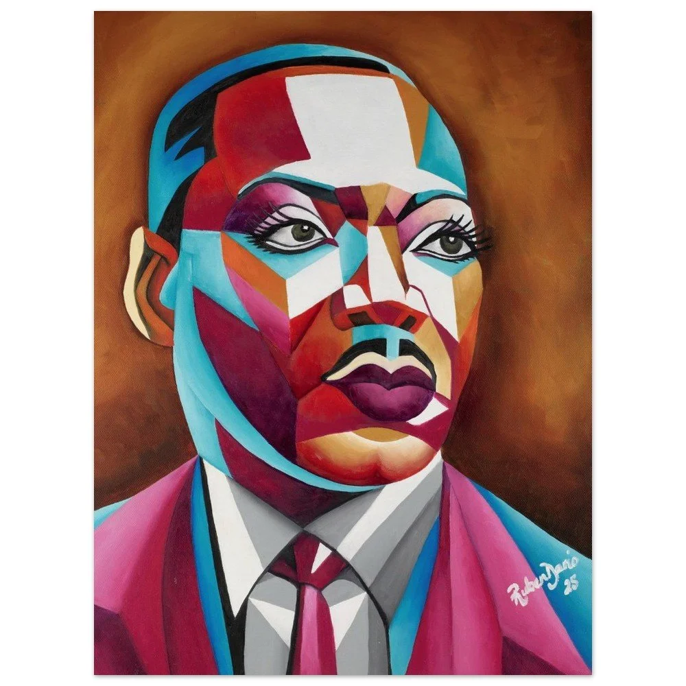 This Fine Art Print (Full Page) is based on an original 16 × 20 inch oil on canvas painting by Ruben Dario and presents Martin Luther King Jr. as a living presence rather than a distant historical figure. The work reflects on dignity, resilience, and the urgency of unfinished promises.
