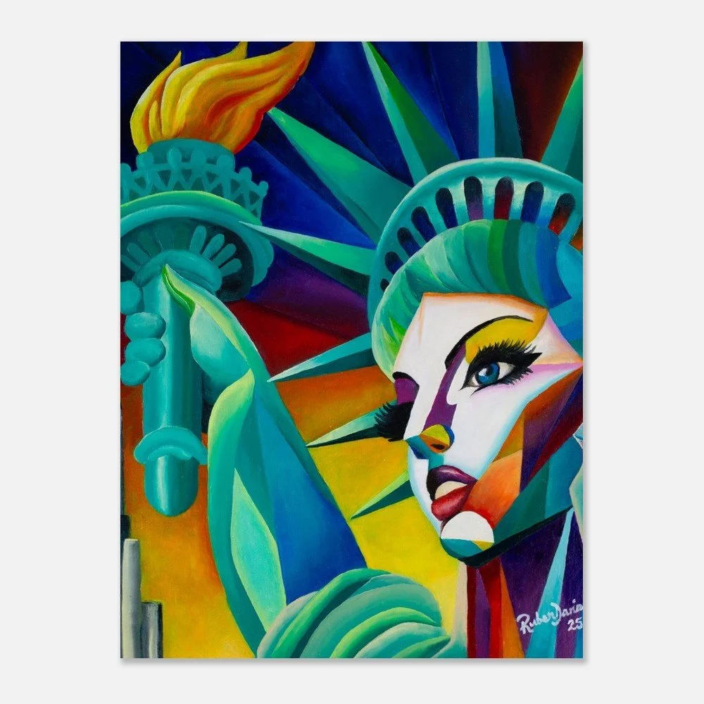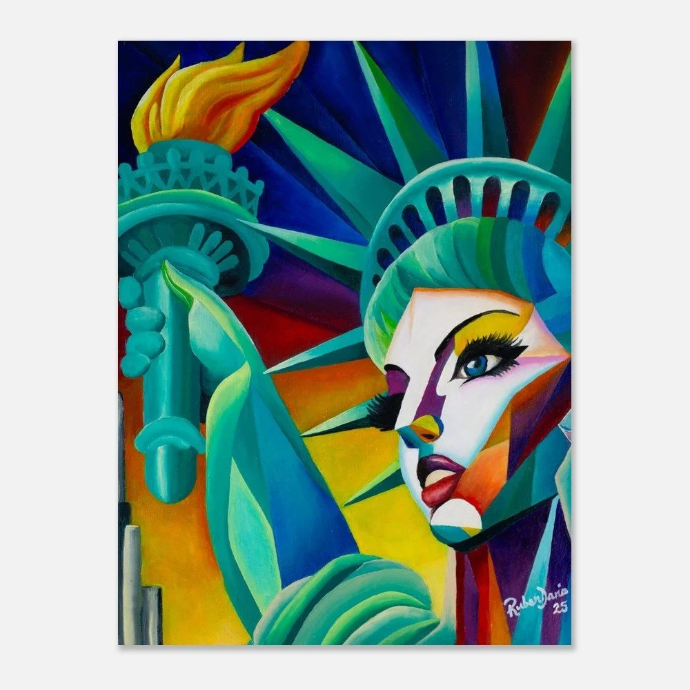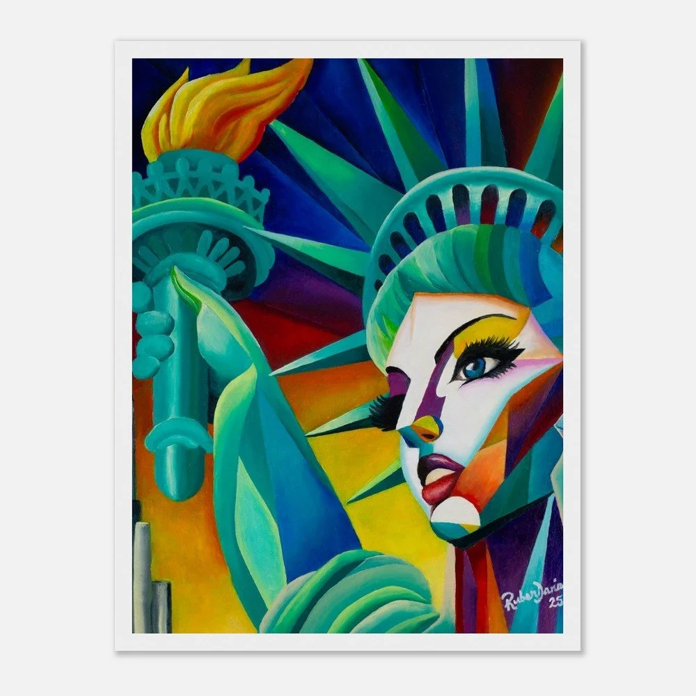 This fine art print is based on an original 12 × 16 inch oil on canvas painting by Ruben Dario and presents Miss Liberty as a living presence rather than a static symbol. The work reflects on freedom as a lived and contested reality, shaped by dignity, inclusion, and voices that refuse to be erased.