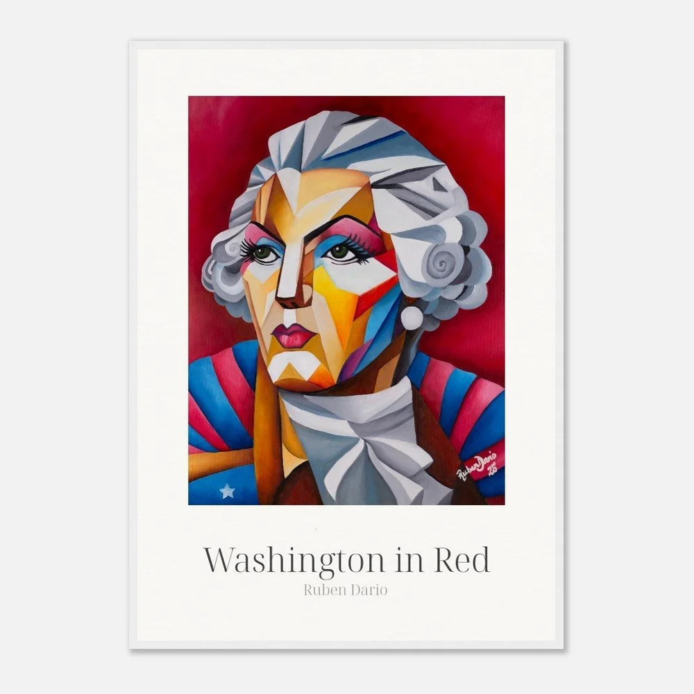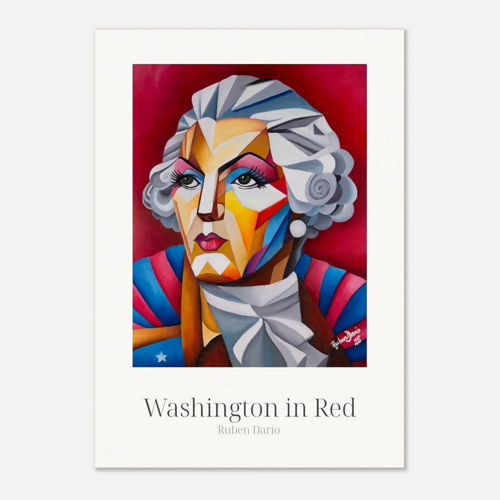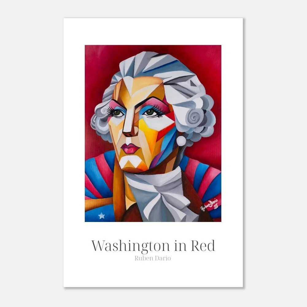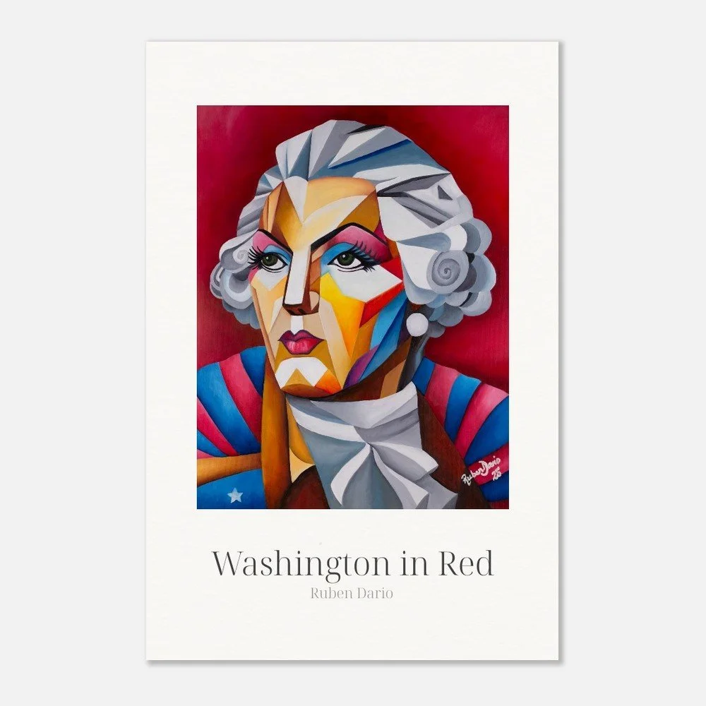 This fine art print is based on an original 18 × 24 inch oil on canvas painting by Ruben Dario and presents George Washington as a living presence rather than a fixed monument. Rendered in bold red tones, the work reflects on leadership, power, and the ideals that shaped a nation, while questioning who those ideals were originally meant to serve.
