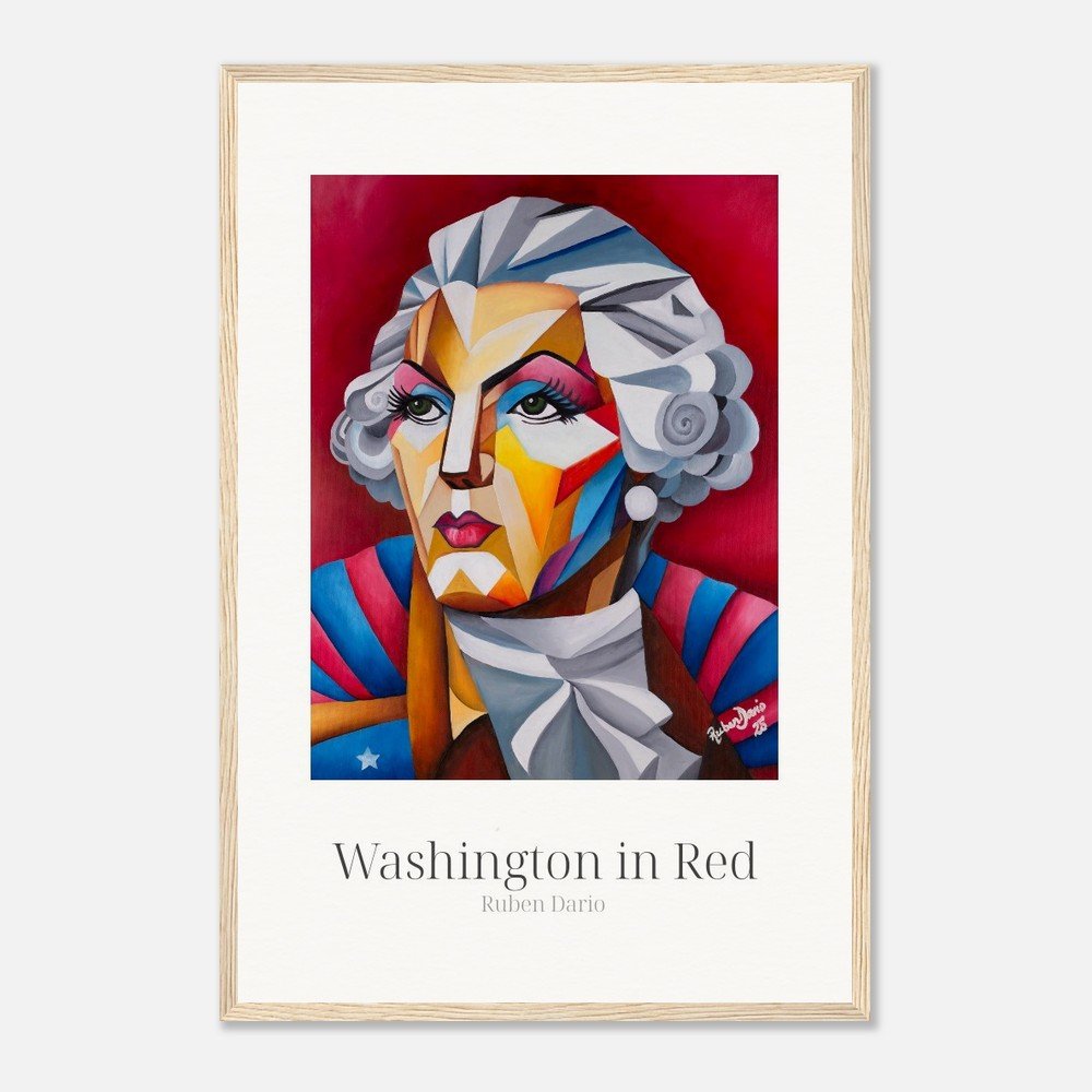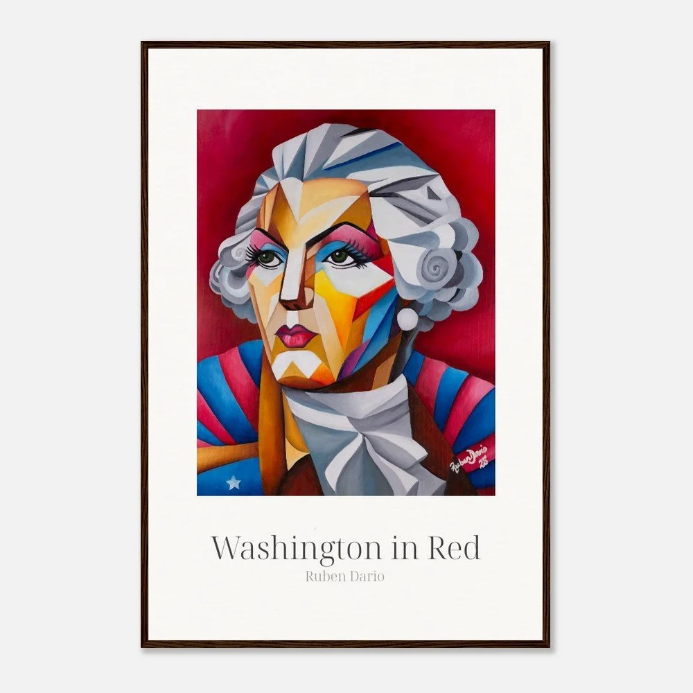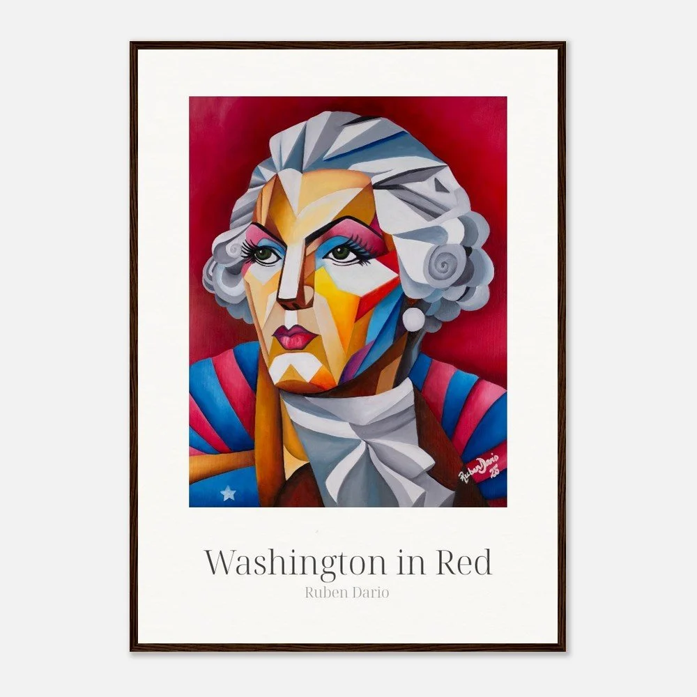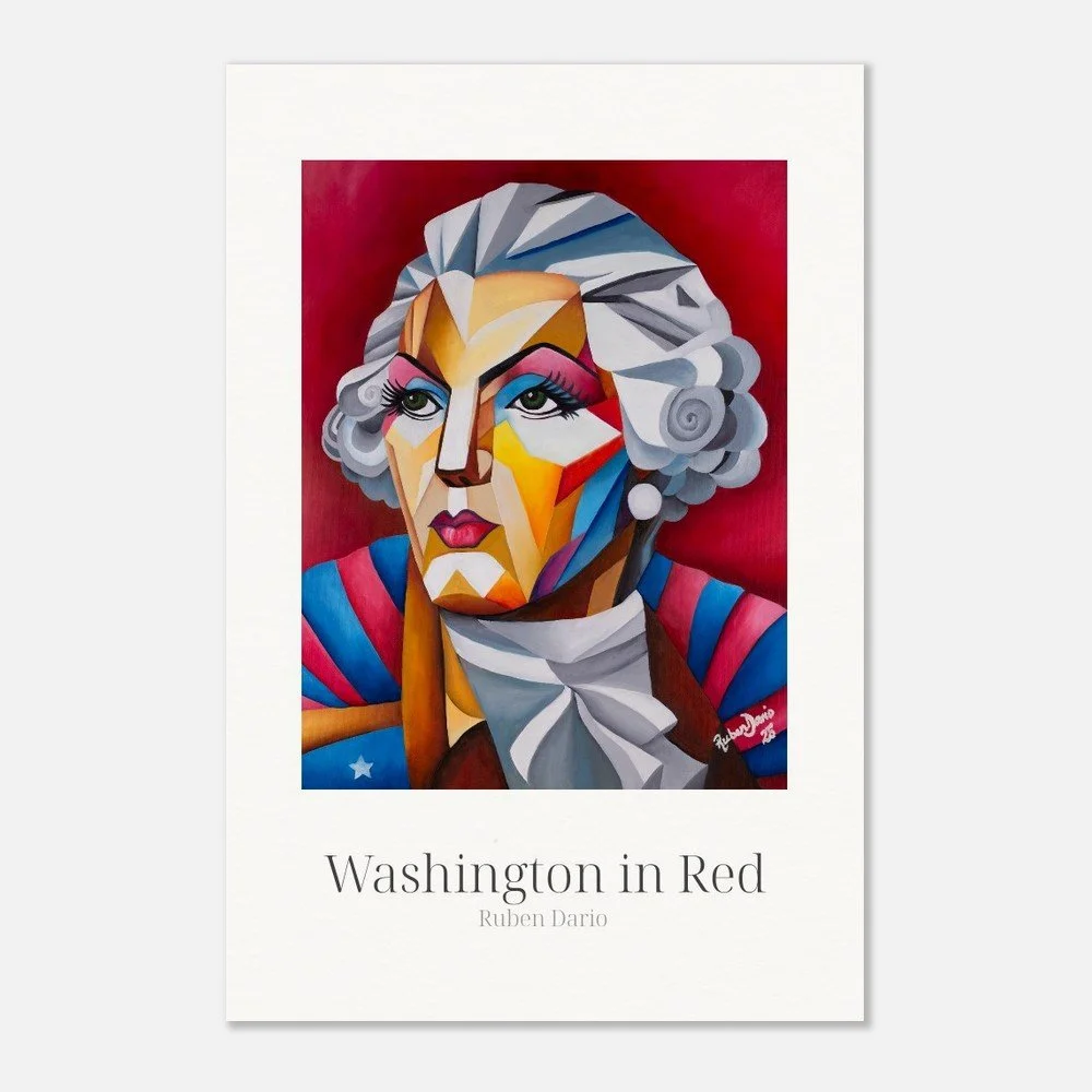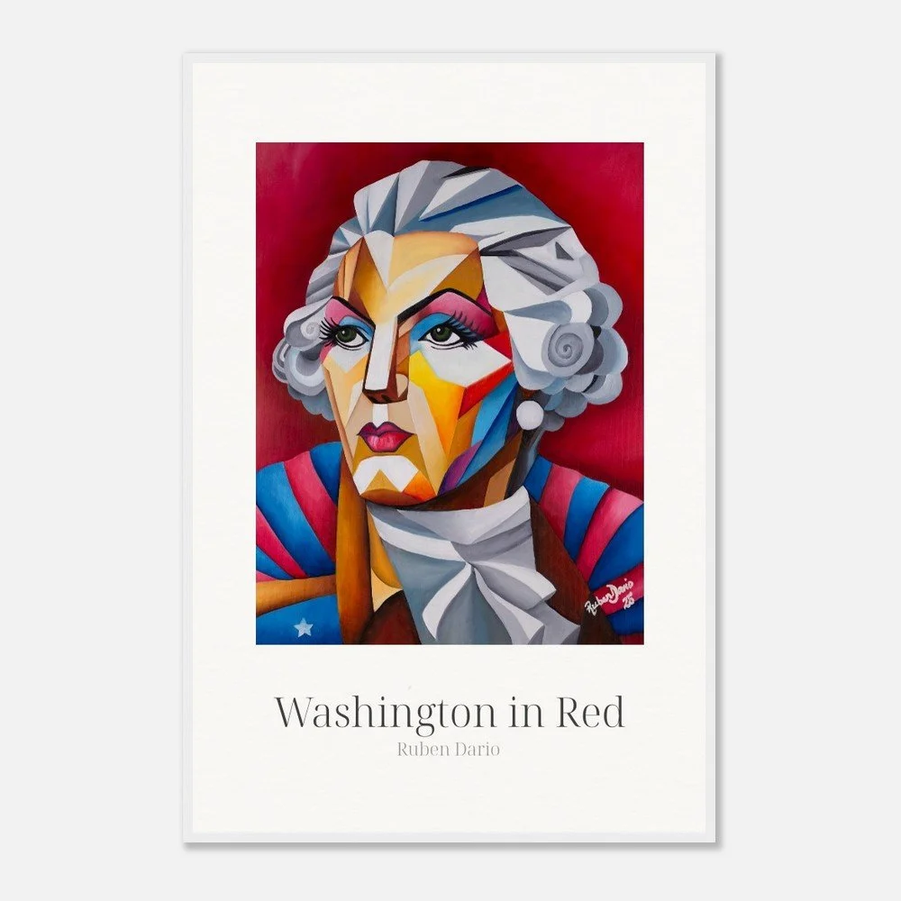 This fine art print is based on an original 18 × 24 inch oil on canvas painting by Ruben Dario and presents George Washington as a living presence rather than a fixed monument. Rendered in bold red tones, the work reflects on leadership, power, and the ideals that shaped a nation, while questioning who those ideals were originally meant to serve.