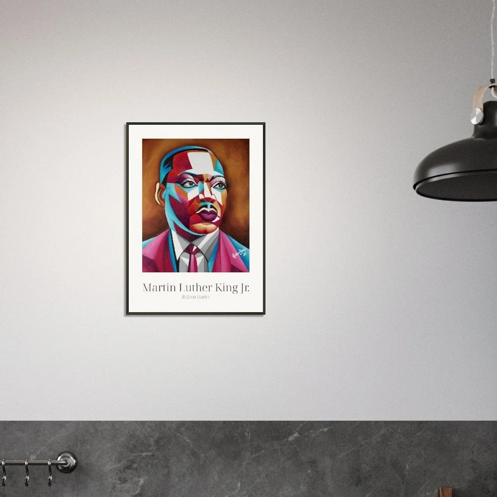 This framed fine art print is based on an original 16 × 20 inch oil on canvas painting by Ruben Dario and presents Martin Luther King Jr. through a contemporary, painterly lens. The work reflects on dignity, resilience, and the enduring presence of voices that refuse to be erased.