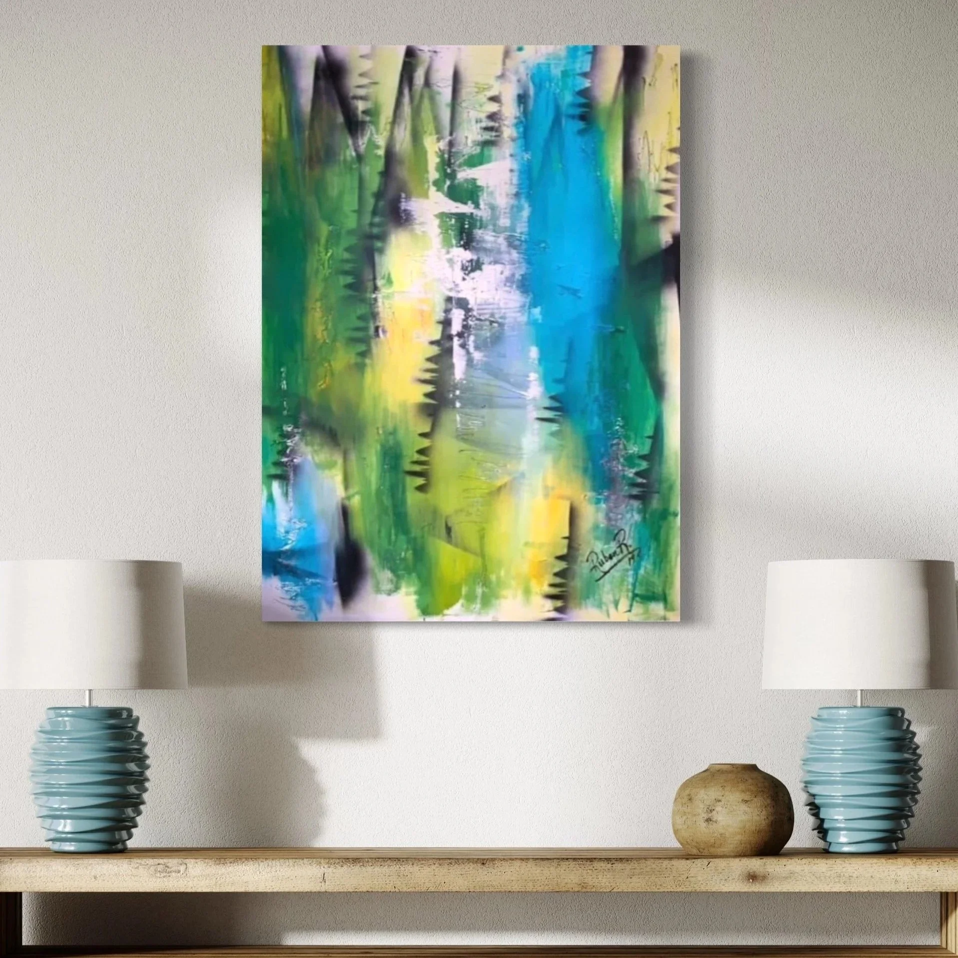 The transition is in full motion, yet undefined. Shapes shift and overlap, with soft curves breaking into angular lines, representing the chaos and ambiguity of being in between states. Muted tones blend and blur, as the present begins to give way to the future, but clarity has not yet been reached.